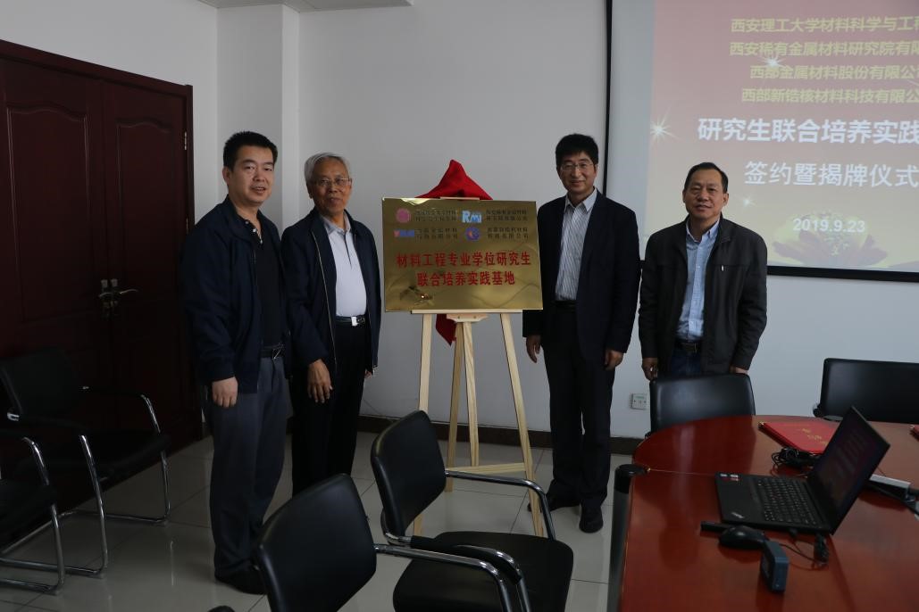 2019年9月23日,西安理工大學材料科學與工程學院院長張國君帶隊,來稀有院參加了西安稀有金屬材料研究院有限公司、西部金屬材料股份有限公司、西部新鋯核材料科技有限公司共建材料工程專業學位研究生聯合培養實踐基地簽約儀式,稀有院田振業常務副院長、張于勝副院長、西部材料李明利總工程師、西部新鋯文惠明總工程師出席簽約儀式。